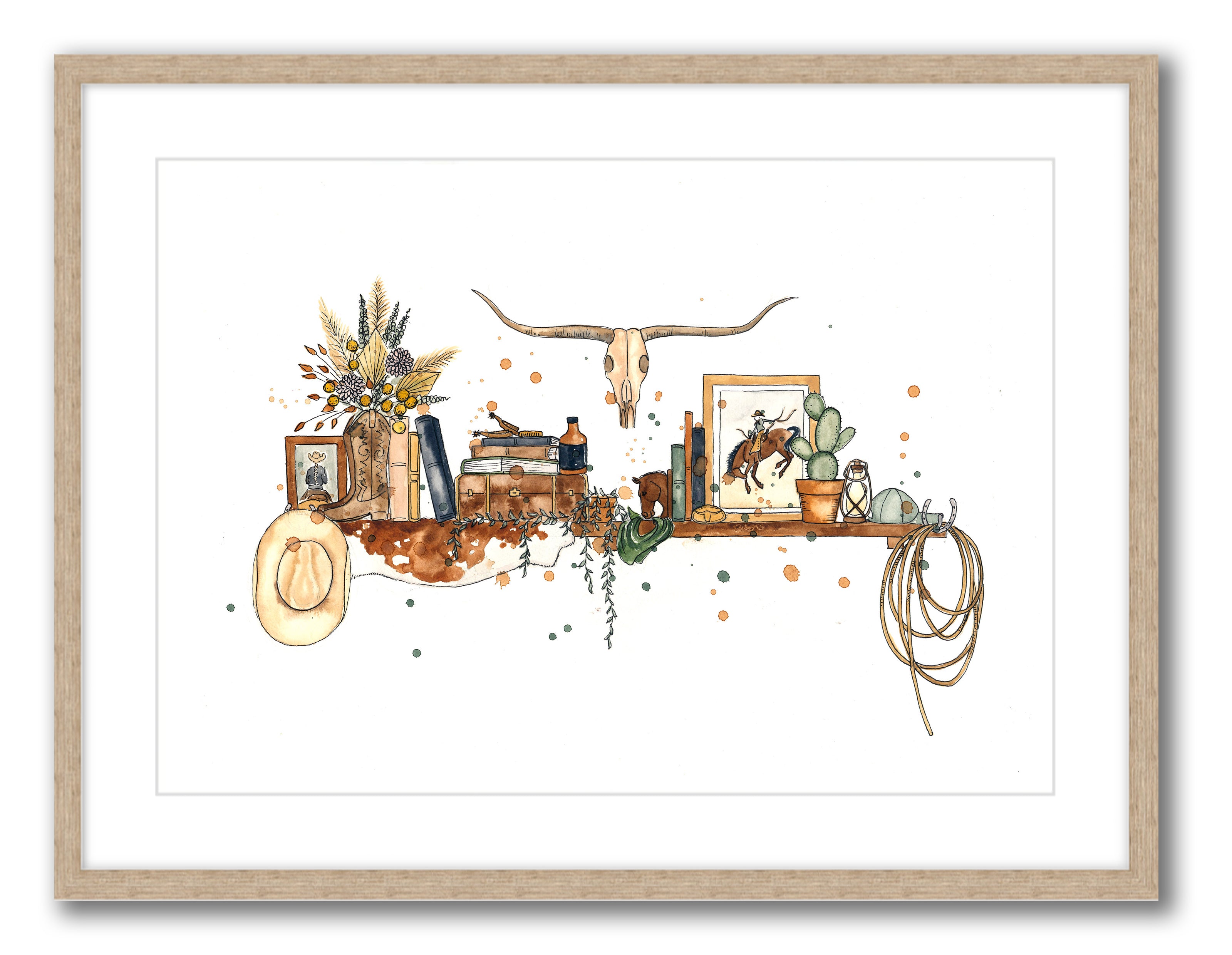 'Cowboy Western Shelf’ is a watercolour fine art print of an original painting by Michelle Clarke. It is printed on 316GSM cotton rag paper.