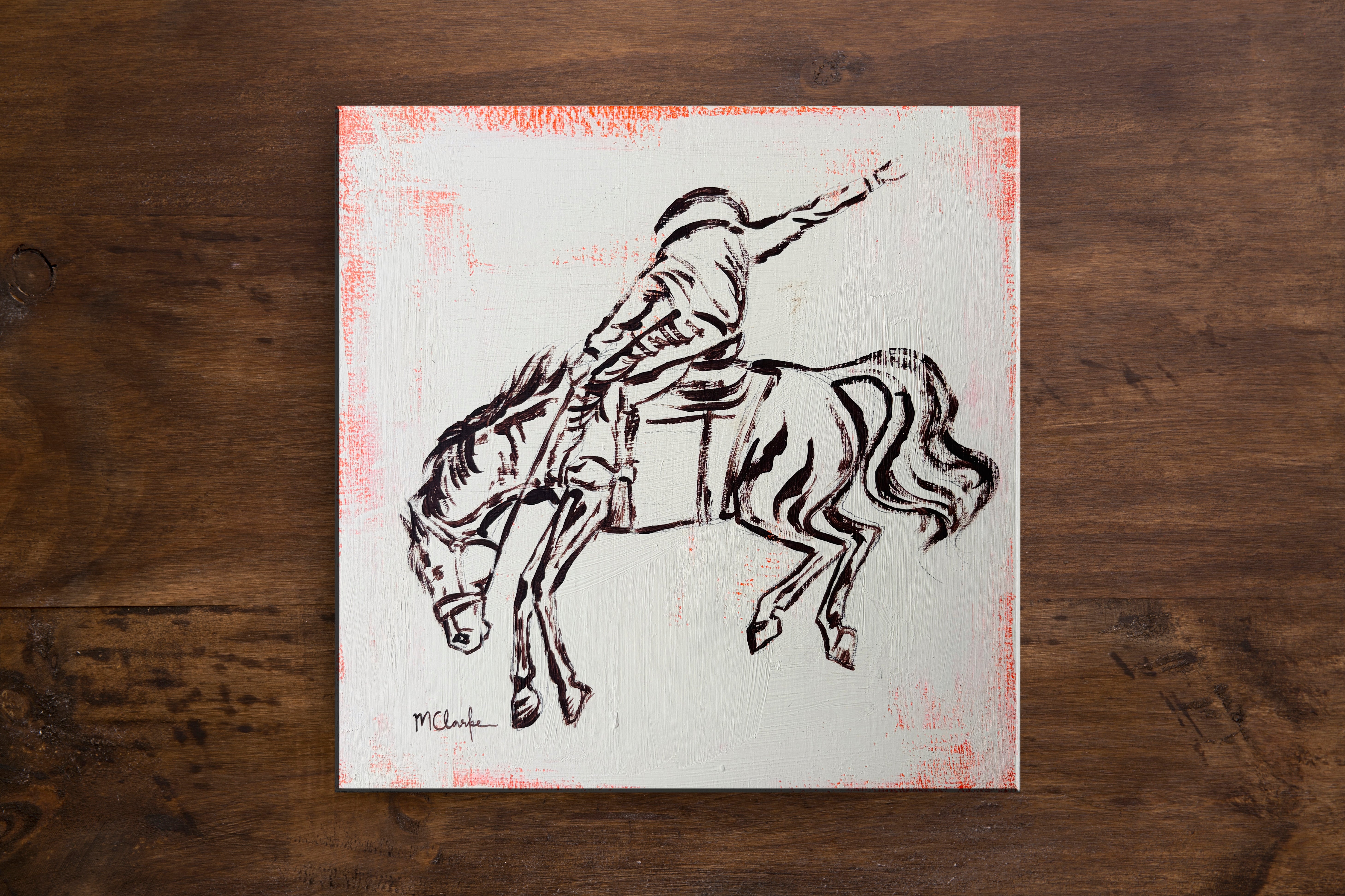 Each piece explores horses not as spectacle, but as presence: resting at the rail, waiting at the gate, standing warm from the sun. A handful of rodeo-inspired works introduce flashes of grit and motion - the split second where balance, instinct, and trust collide.