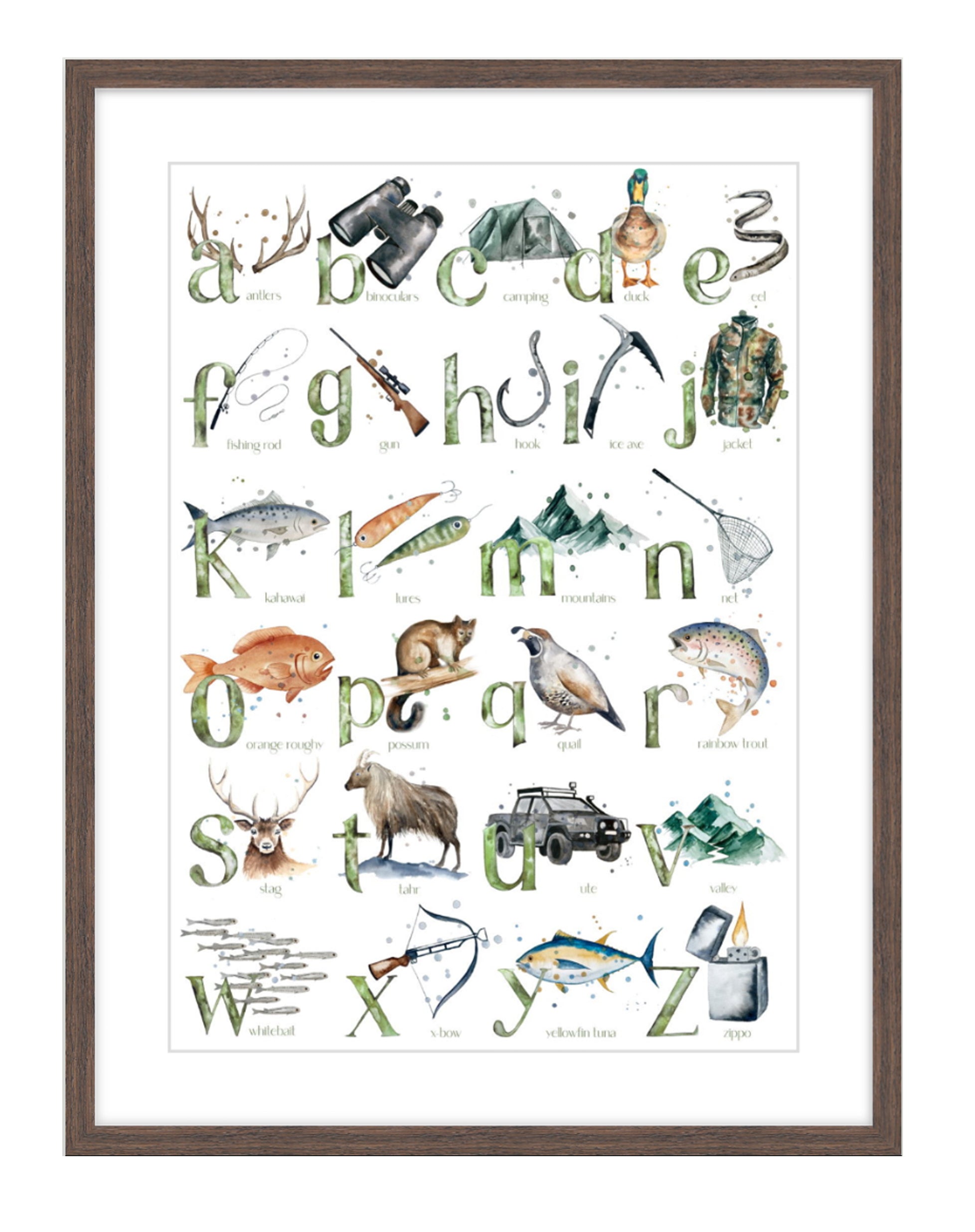 ’Hunting & Fishing ABC’ is a watercolour fine art print of an original painting by Michelle Clarke. It is printed on 316GSM cotton rag paper.