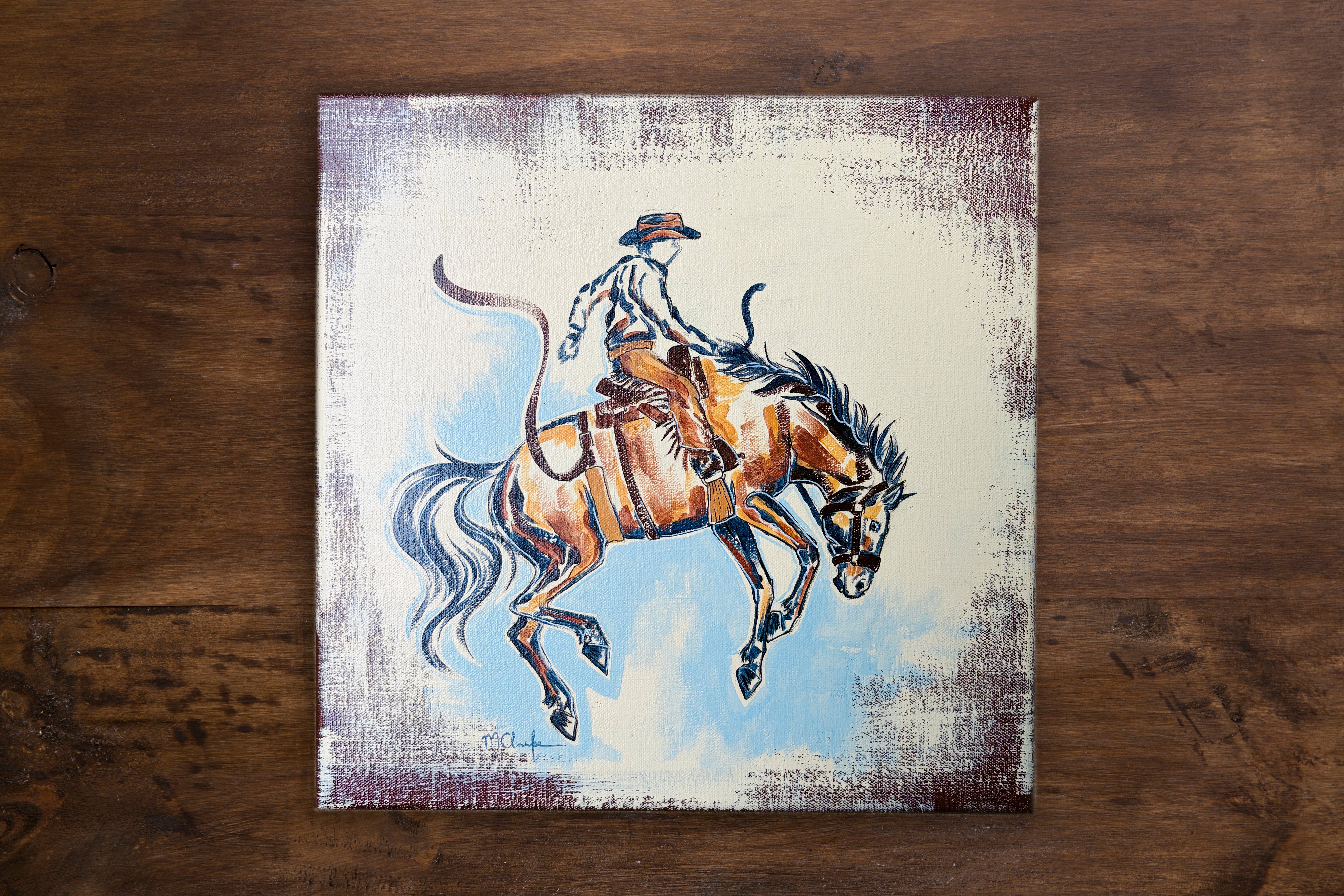 Each piece explores horses not as spectacle, but as presence: resting at the rail, waiting at the gate, standing warm from the sun. A handful of rodeo-inspired works introduce flashes of grit and motion - the split second where balance, instinct, and trust collide.